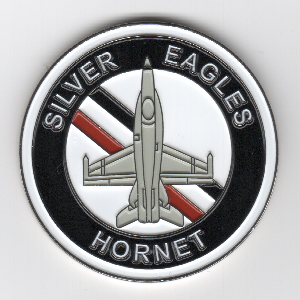 This is the front view of the 1.5-inch diameter “challenge coin” for the VMFA-115 Silver Eagles. It shows their aircraft (F/A-18 Hornet) on the front and (below) is the first aircraft they flew (F-4U Corsair), when they were established in 1943. Only have a few of these……