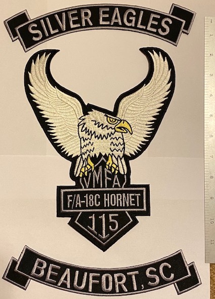 The “Silver Eagles” of VMFA-115 fly the F/A-18A Hornet from MCAS Beaufort, SC. They flew the F-4 Phantoms under MAG-31 during Vietnam, then later transitioned to the A-model Hornets in 1985. They routinely deploy to MCAS Iwakuni, Japan. This is the F/A-18A++ version of their “BACKPATCH” that AV8RSTUFF created for them and it comes in three pieces. The top piece says “SILVER EAGLES”, the bottom rocker says “BEAUFORT, SC” and the middle patch is the HUGE bird with their insignia and aircraft info. This version was created for their F/A-18C Hornet transition to this aircraft…..These patches do not come with velcro already attached as it’s designed to be sewn on the back of a jacket…AWESOME PATCH!!!!