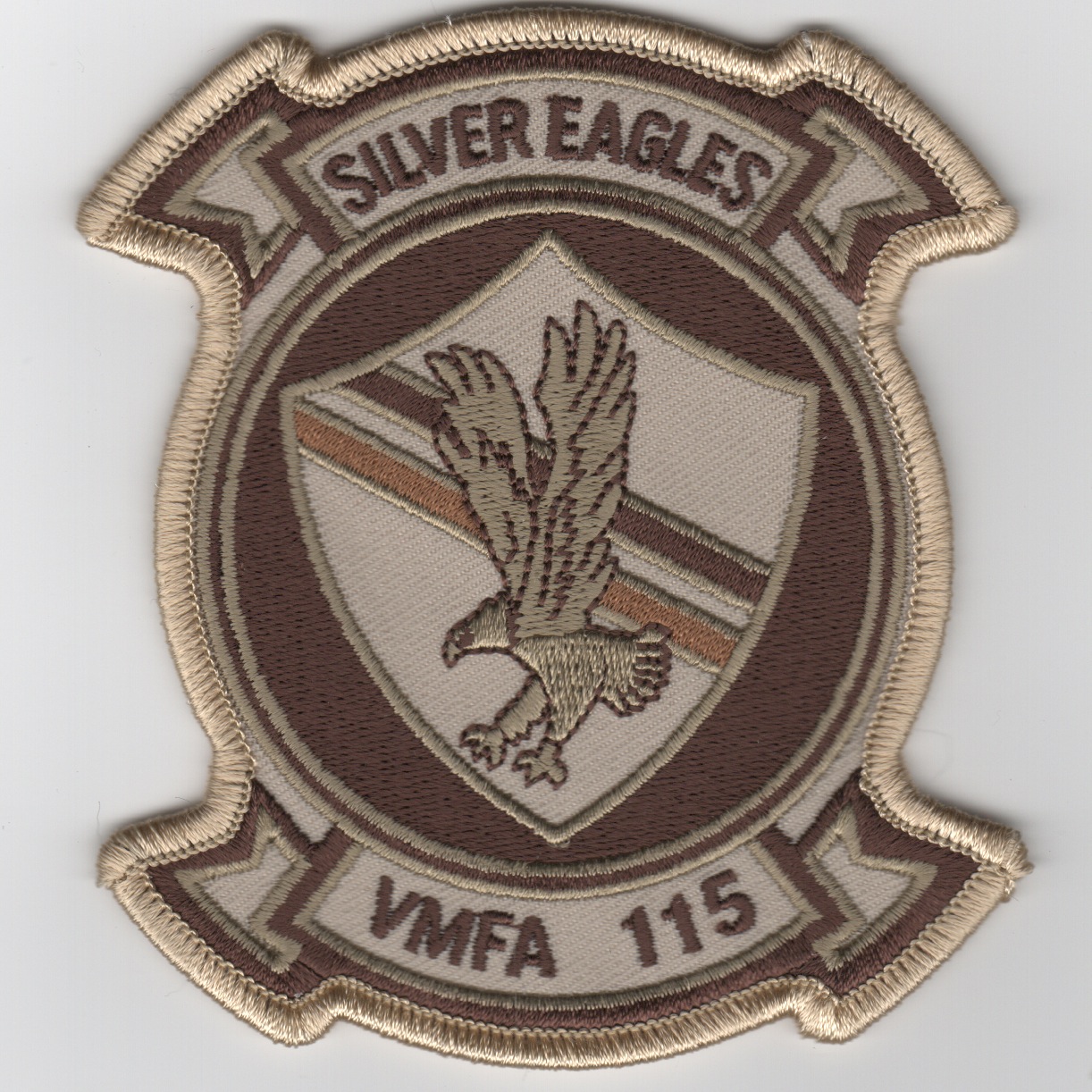 This is the desert version of the squadron patch for the VMFA-115 Silver Eagles. The “Silver Eagles” of VMFA-115 fly the F/A-18A Hornet from MCAS Beaufort, SC. They flew the F-4 Phantoms under MAG-31 during Vietnam, then later transitioned to the A-model Hornets in 1985. They routinely deploy to MCAS Iwakuni, Japan. This patch DOES come with velcro already attached.
