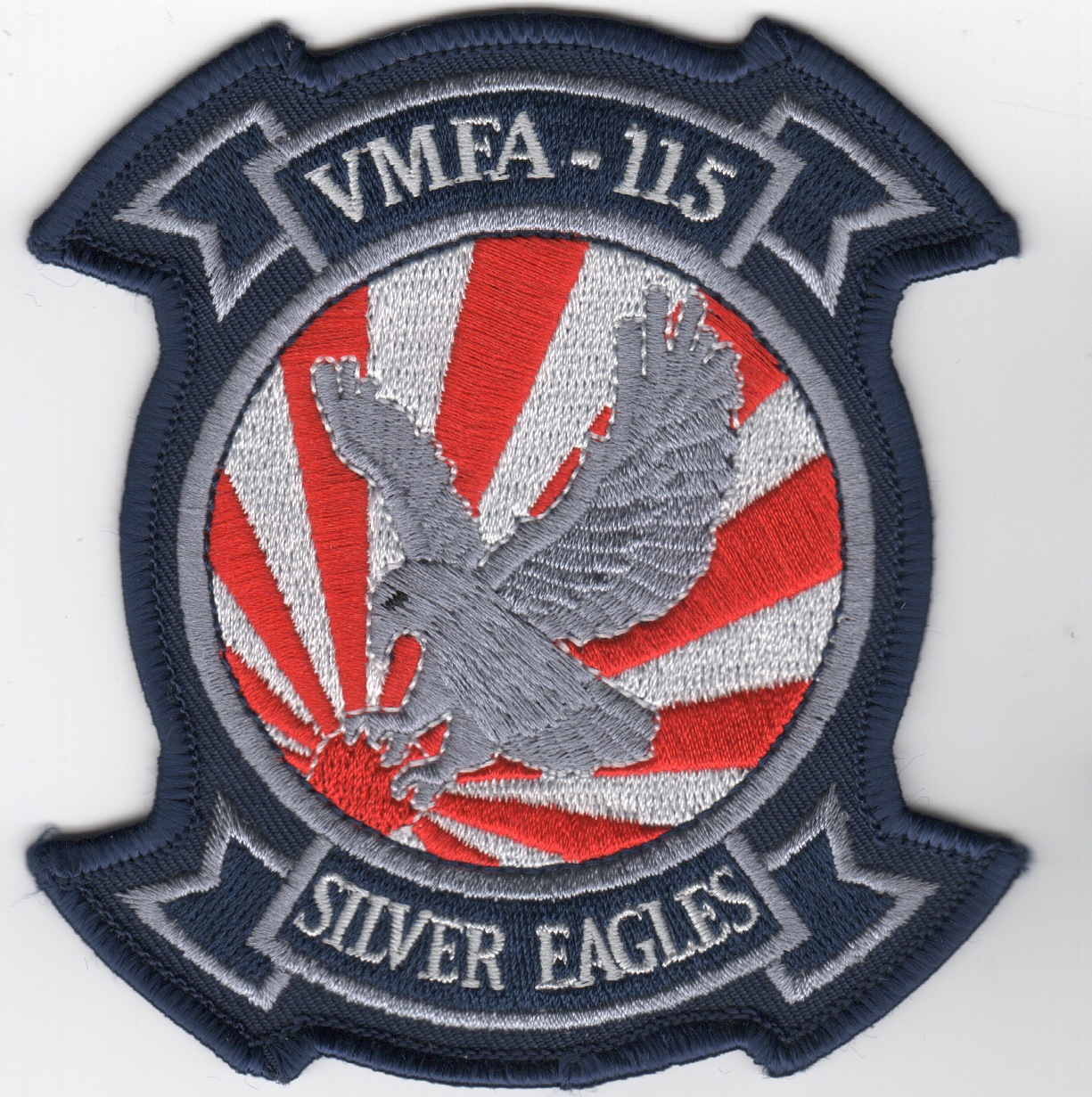 This is the dark blue version of the squadron patch used for the “Japan Det” for the VMFA-115 Silver Eagles. The “Silver Eagles” of VMFA-115 fly the F/A-18A Hornet from MCAS Beaufort, SC. They flew the F-4 Phantoms under MAG-31 during Vietnam, then later transitioned to the A-model Hornets in 1985. They routinely deploy to MCAS Iwakuni, Japan. This patch does not come with velcro already attached.