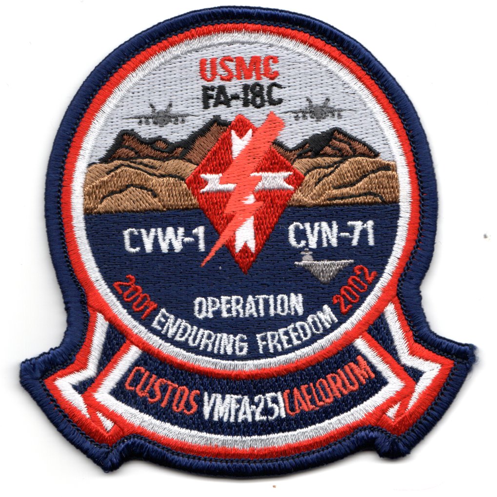 The “Thunderbolts” of VMFA-251 fly the F/A-18A out of MCAS Beaufort, SC. They operate under MAG-31 and were the third East Coast operational Marine squadron to transition to the Hornet after many years with the F-4 Phantom. They have the Lightening flash on their tails, and also share the same “nickname” with the Navy’s HSL-84. They currently operate with CVW-1 onboard the USS Roosevelt (CVN-71) and this is their 2001-2002 OEF deployment patch. This patch does not come with velcro attached.