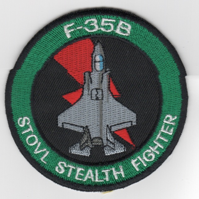 This is the ‘Green Knights’ Aircraft bullet patch for their new platform, the F-35B STOVL Stealth Fighter. This is the “green/black” color scheme of the squadron’s colors and was found in a Korean embroidery shop, so it has that “theater-made” feel to it and does not come with velcro attached.