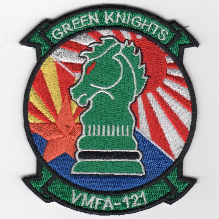 This is the deployment version of the VMFA-121 squadron patch when they detached to the Pacific Theater. It depicts two flags behind the “Knight” (Japan and Korea?) and was worn by the squadron while there. This was found in a Korean embroidery shop, so it has that “theater-made” feel to it and does not come with velcro attached.