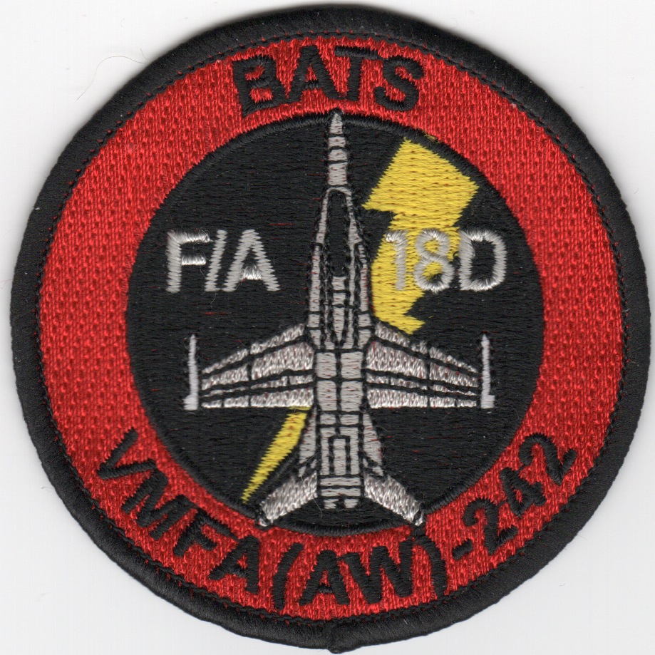 Marine All- Weather Fighter Attack Squadron 242 (VMFA(AW)-242) is a USMC fighter squadron flying F/A-18D Hornets. The squadron, known as the “Bats”, is based at Marine Corps Air Station Iwakuni, Japan (2017) and falls under the command of Marine Aircraft Group 12 (MAG-12) and the 1st Marine Aircraft Wing (1st MAW). This is the red version of their Hornet ‘Bullet’ patch and does not come with velcro attached.