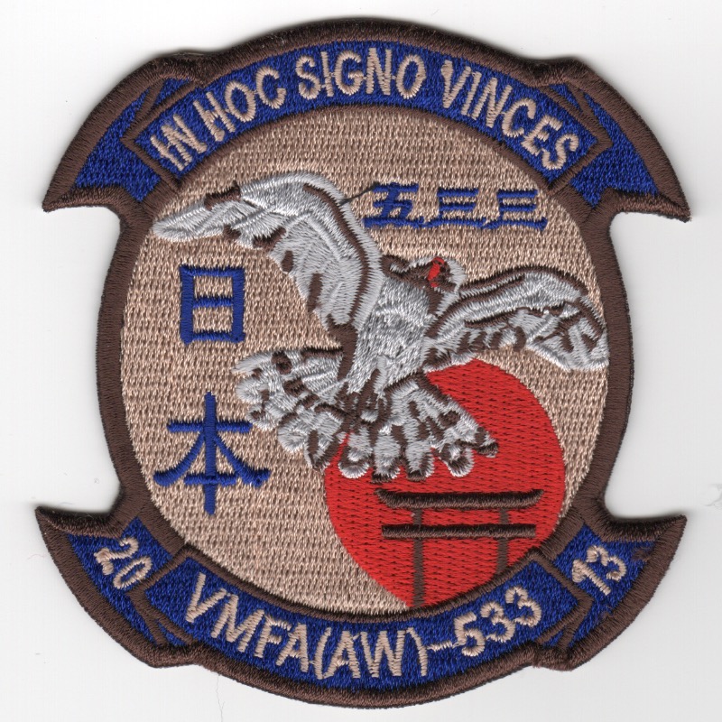 Marine All-Weather Fighter Attack Squadron 533 (VMFA(AW)-533) is a USMC F/A-18 Hornet squadron. Also known as the “Hawks”, the squadron is based at Marine Corps Air Station Beaufort, SC and falls under the command of Marine Aircraft Group 31 (MAG-31) and the 2nd Marine Aircraft Wing (2nd MAW). This version of the squadron patch depicts the Japanese Sun/Script and was found in a Korean embroidery shop. No velcro attached.