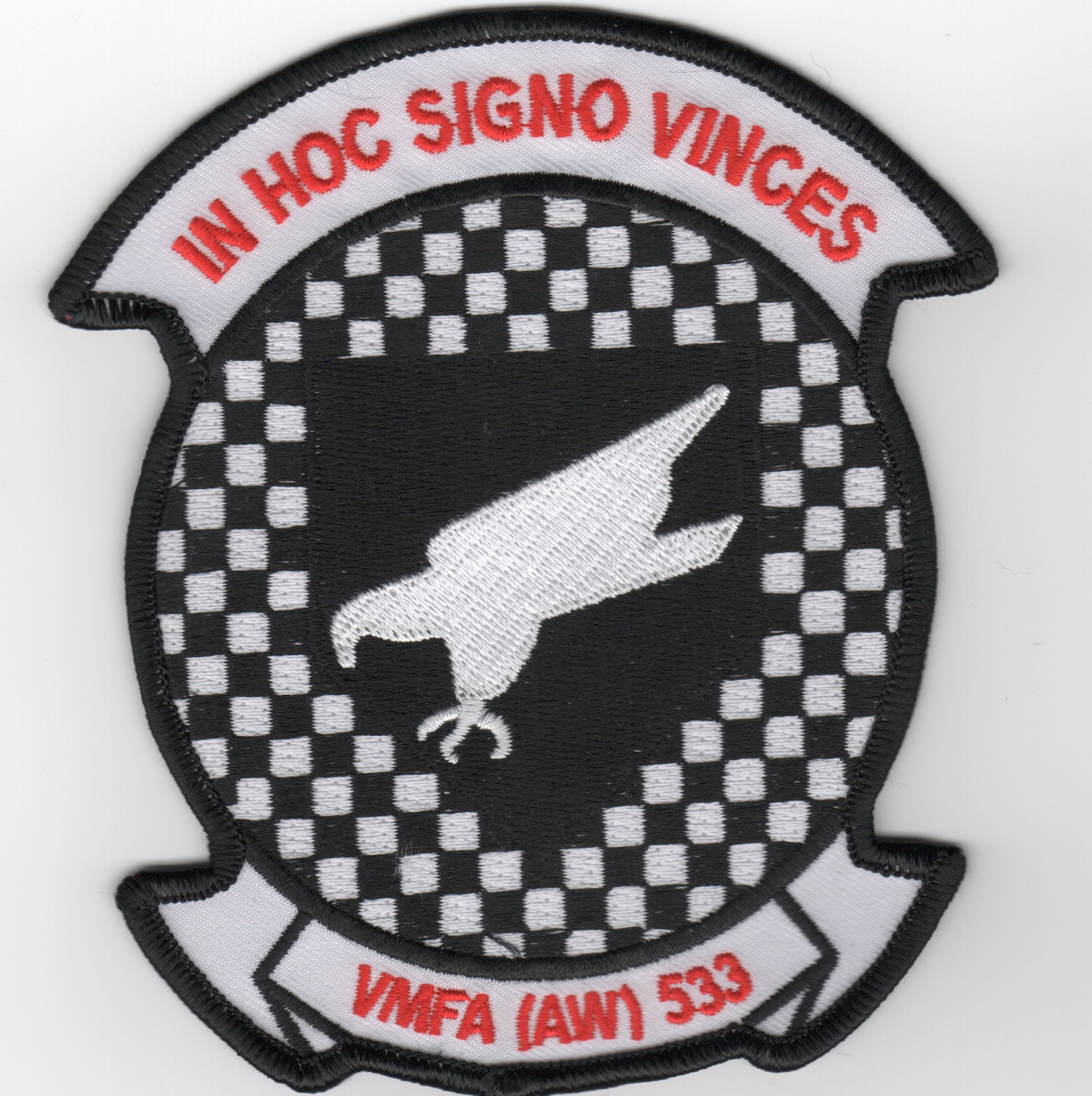 This is the LARGE version of the ‘black/white’ checkered pattern of the squadron patch for the VMFA(AW)-533 ‘Hawks’. Years ago, they flew the A-6 Intruder out of MCAS Cherry Point, NC under the watchful eyes of MAG-14. They deployed to Sheik Isa air base, Bahrain for Operation Desert Storm and have since converted to the F/A-18D Hornet flying out of MCAS Beaurfort, SC. This patch does not have velcro attached.
