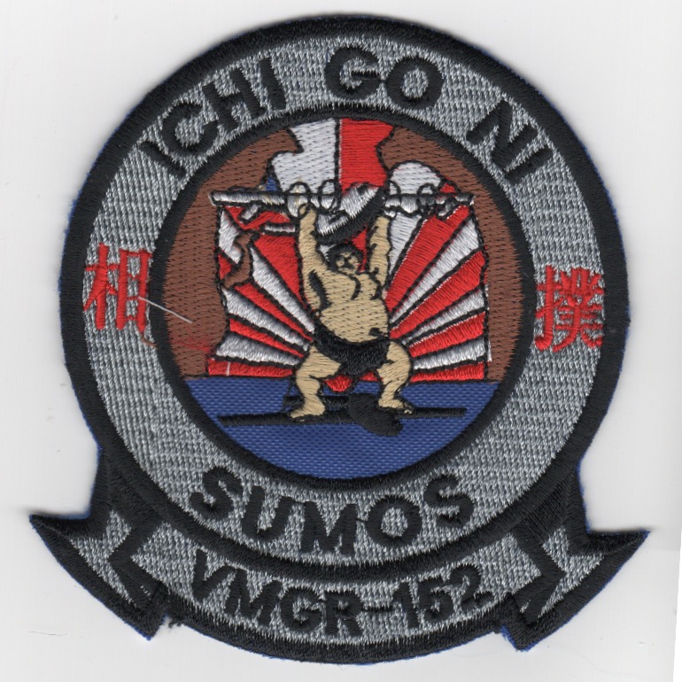 (Korean): Marine Aerial Refueler Transport Squadron 152 (VMGR-152) provides aerial refueling service to support Fleet Marine Force (FMF) air operations; and provides assault air transport of personnel, equipment, and supplies. The squadron, known as the “Sumos”, flies the fixed-wing Lockheed Martin KC-130J aircraft. VMGR-152 is stationed at Marine Corps Air Station Iwakuni, Iwakuni, Japan and is part of Marine Aircraft Group 12 (MAG-12) and the 1st Marine Aircraft Wing (1st MAW). This is the medium-sized, dark gray version of their ICHI-GO-NI patch, says “SUMOS” along the bottom and does not come with velcro attached.