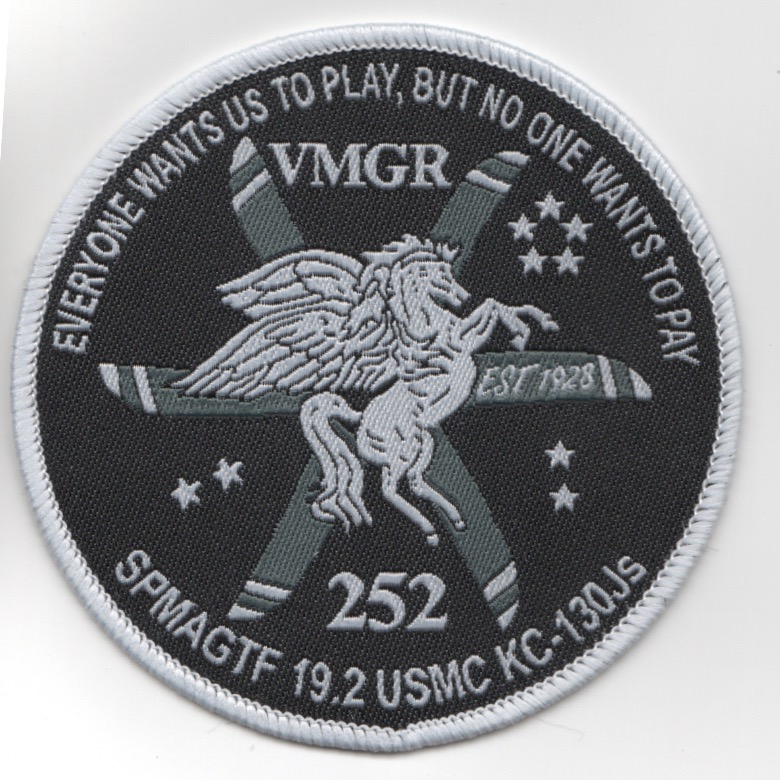 This is the Det Patch for VMGR-252 for their participation in SPMAGTF 19.2 flying the USMC KC-130Js. It says “EVERYONE WANTS US TO PLAY, BUT NO ONE WANTS TO PAY”. This is a “woven” patch that we picked up directly from their supplier and does not come with velcro attached.