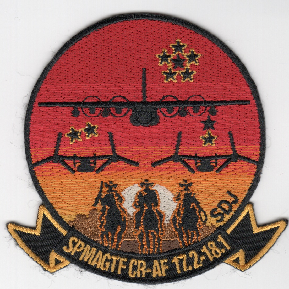VMM-261 Mission is stated above. This is the detachment patch for the VMM-261 “”””Special Purpose Marine Air-Ground Task Force”””” (SPMAGTF) for their participation in the exercises. This patch covers their role in 17.2-18.1 and shows a C-130 with two MV-22’s underneath. This patch does not come with velcro attached.