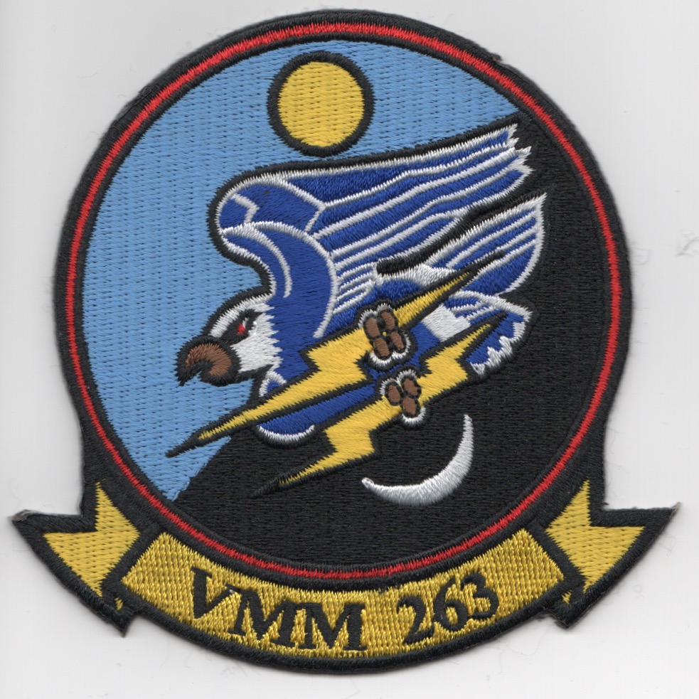 Marine Medium Tiltrotor Squadron 263 (VMM-263) is a United States Marine Corps tiltrotor squadron consisting of MV-22B Osprey transport aircraft. The squadron, known as the “Thunder Eagles”, is based at Marine Corps Air Station New River, North Carolina and falls under the command of Marine Aircraft Group 26 (MAG-26) and the 2nd Marine Aircraft Wing (2nd MAW). This is the ‘yellow tab’ version of their squadron patch that does NOT have “REIN” and does not come with velcro attached..