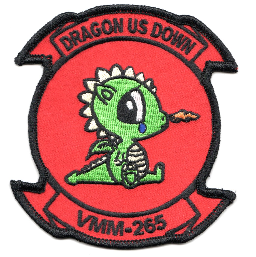 This is the red version of the detachment patch created for VMM-265. It says “”””DRAGON US DOWN”””” and shows a green dragon with a blue tear and “”””baby smoke”””” coming out of it’s nostril. This patch does not have velcro attached.