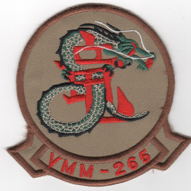 (Korean): This is the theater-made, Korean desert version of the squadron patch for VMM-265 that has the “thick” red letters in the bottom tab, but DOES NOT say ‘REIN’ (REINforced). VMM-265 is a United States Marine Corps transport squadron consisting of MV-22 Osprey tiltrotor aircraft. The squadron, known as the “Dragons”, is based at Marine Corps Air Station Futenma, Okinawa, Japan and falls under the command of Marine Aircraft Group 36 (MAG-36) and the 1st Marine Aircraft Wing (1st MAW).