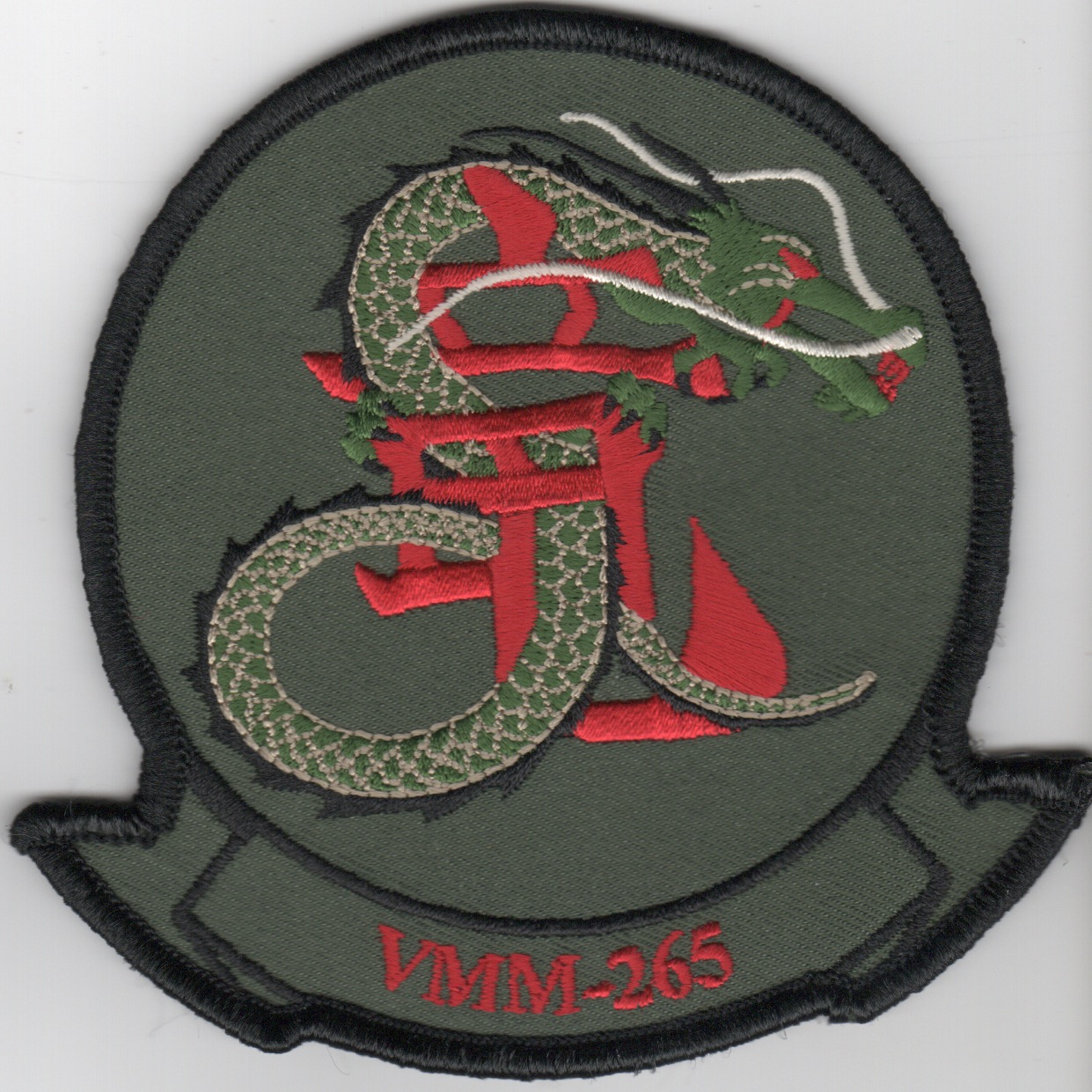 This is the no “REIN” squadron patch for VMM-265 ‘REIN’ that has the red letters in the bottom tab. VMM-265 is a United States Marine Corps transport squadron consisting of MV-22 Osprey tiltrotor aircraft. The squadron, known as the “Dragons”, is based at Marine Corps Air Station Futenma, Okinawa, Japan and falls under the command of Marine Aircraft Group 36 (MAG-36) and the 1st Marine Aircraft Wing (1st MAW).
