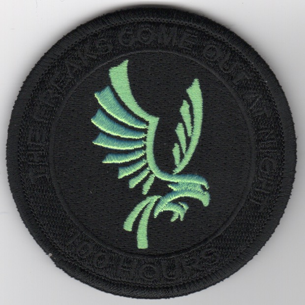(Another AV8RSTUFF Creation): VMM-266 history is shown above, so I’m not repeating here. This is the ‘100 HOURS’ created for the squadron that says ‘THE FREAKS COME OUT AT NIGHT’ (hard to read since it is also in black thread) and has their squadron mascot in “IR-Green” threading. This patch also does have velcro attached.