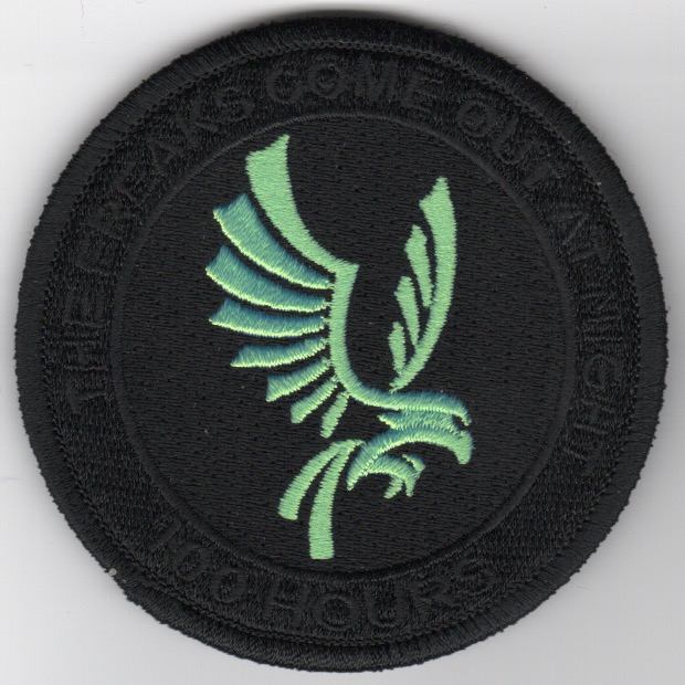 (Another AV8RSTUFF Creation): VMM-266 history is shown above, so I’m not repeating here. This is the ‘200 HOURS’ created for the squadron that says ‘THE FREAKS COME OUT AT NIGHT’ (hard to read since it is also in black thread) and has their squadron mascot in “IR-Green” threading. This patch also does have velcro attached.