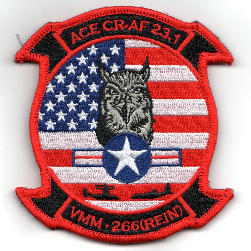 (Another AV8RSTUFF Creation): VMM-266 Mission is to support the Marine Air Ground Task Force (MAGTF) commander by providing tactical mobility and logistical support for the MAGTF, day or night, in all weather conditions. VMM-266 does this by conducting mission essential tasks, which include shipboard operations, sea and air deployment operations, air assault, amphibious assaults and raids, distribution of supplies and other transport services, joint personnel recovery, and conduct of noncombatant evacuation. This is their deployed squadron patch in support of the ACE CRAF 23.1 exercise that has the “white flag stripe” under the field of blue stars (standard arrangement and does have velcro attached.