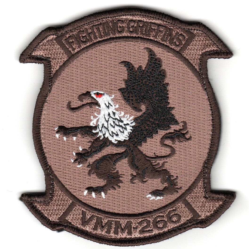 (Another AV8RSTUFF Creation): VMM-266 Mission is to support the Marine Air Ground Task Force (MAGTF) commander by providing tactical mobility and logistical support for the MAGTF, day or night, in all weather conditions. VMM-266 does this by conducting mission essential tasks, which include shipboard operations, sea and air deployment operations, air assault, amphibious assaults and raids, distribution of supplies and other transport services, joint personnel recovery, and conduct of noncombatant evacuation. This is the DESERT/FULLY-Embroidered version of the patch that was created for the squadron for when they deploy and wear the tan flight suits. This patch does have velcro attached.