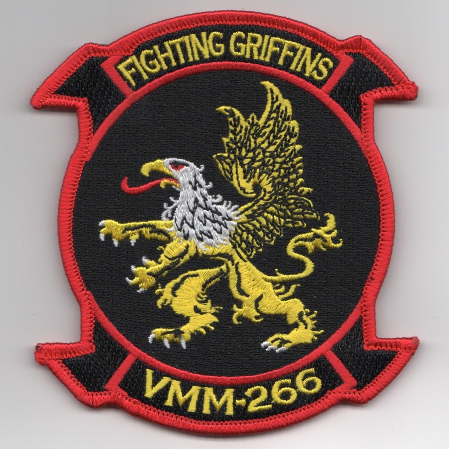 (Another AV8RSTUFF Creation): VMM-266 Mission is to support the Marine Air Ground Task Force (MAGTF) commander by providing tactical mobility and logistical support for the MAGTF, day or night, in all weather conditions. VMM-266 does this by conducting mission essential tasks, which include shipboard operations, sea and air deployment operations, air assault, amphibious assaults and raids, distribution of supplies and other transport services, joint personnel recovery, and conduct of noncombatant evacuation. This is their ‘regular’ squadron patch and DOES have velcro attached.