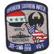 This is the deployment patch for the VQ-1 “”””World Watchers”””” when they participated in Operation Southern Watch JTF-SWA after Operation Desert Storm. They were established in June 1955 and currently fly the EP-3E Aries I model.