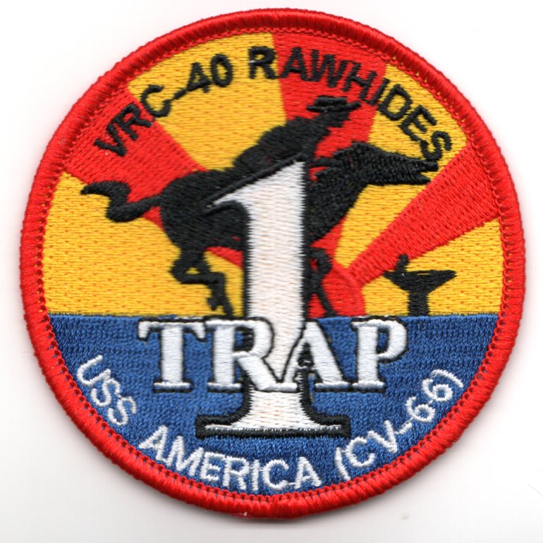 The “Rawhides” of VRC-40 fly the C-2A out of NAS Norfolk, VA and were established in July 1960. They were originally known as ‘Codfish Airlines’ and have supported Atlantic Fleet operations the entire time. This is their ‘1-Trap’ patch created for those with “just one trap” onboard the USS AMERICA (CV-66). This patch does NOT come with velcro attached.