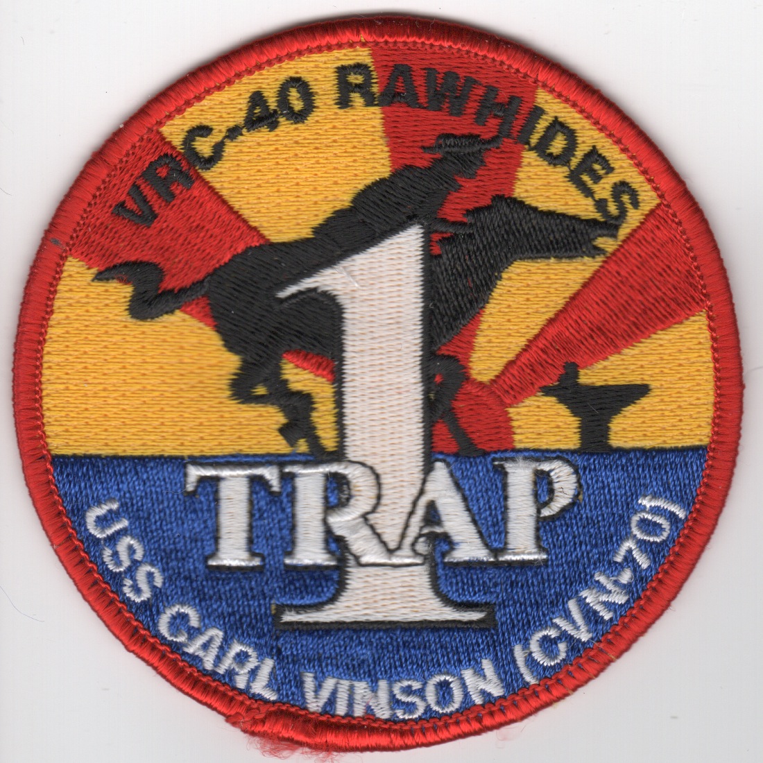 The “Rawhides” of VRC-40 fly the C-2A out of NAS Norfolk, VA and were established in July 1960. They were originally known as ‘Codfish Airlines’ and have supported Atlantic Fleet operations the entire time. This is their ‘1-Trap’ patch created for those with “just one trap” onboard the USS Carl Vinson (CVN-70). This patch does NOT come with velcro already attached.