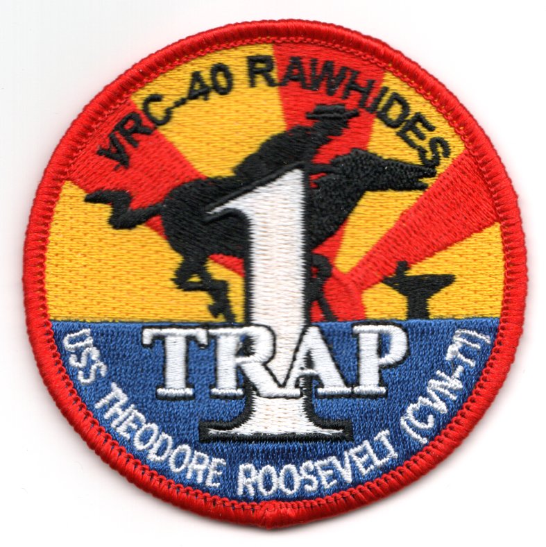 The “Rawhides” of VRC-40 fly the C-2A out of NAS Norfolk, VA and were established in July 1960. They were originally known as ‘Codfish Airlines’ and have supported Atlantic Fleet operations the entire time. This is their ‘1-Trap’ patch created for those with “just one trap” onboard the USS Theodore Roosevelt (CVN-71). This patch does NOT come with velcro already attached.