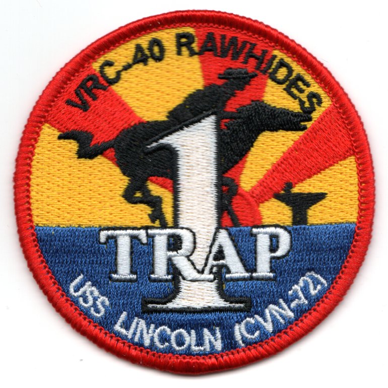 The “Rawhides” of VRC-40 fly the C-2A out of NAS Norfolk, VA and were established in July 1960. They were originally known as ‘Codfish Airlines’ and have supported Atlantic Fleet operations the entire time. This is their ‘1-Trap’ patch created for those with “just one trap” onboard the USS ABRAHAM LINCOLN (CVN-72). This patch does NOT come with velcro attached.