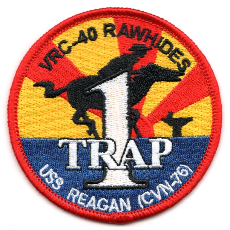 The “Rawhides” of VRC-40 fly the C-2A out of NAS Norfolk, VA and were established in July 1960. They were originally known as ‘Codfish Airlines’ and have supported Atlantic Fleet operations the entire time. This is their ‘1-Trap’ patch created for those with “just one trap” onboard the USS RONALD REAGAN (CVN-76). This patch does NOT come with velcro attached.