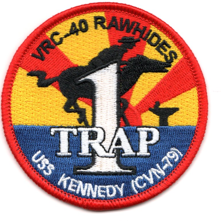The “Rawhides” of VRC-40 fly the C-2A out of NAS Norfolk, VA and were established in July 1960. They were originally known as ‘Codfish Airlines’ and have supported Atlantic Fleet operations the entire time. This is their ‘1-Trap’ patch created for those with “just one trap” onboard the USS JOHN F. KENNEDY (CVN-79). This patch does NOT come with velcro attached.