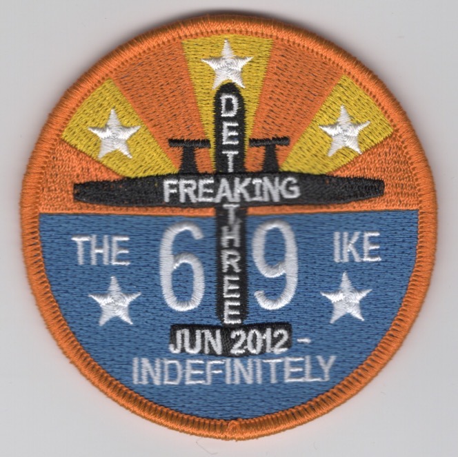 The “Rawhides” of VRC-40 fly the C-2A out of NAS Norfolk, VA and were established in July 1960. They were originally known as ‘Codfish Airlines’ and have supported Atlantic Fleet operations the entire time. This is DET-3’s color version of their “DET FREAKIN THREE” patch supporting the USS EISENHOWER (CVN-69) and says “JUN 2012 – INDEFINITELY” with a big ole’ 6 9 it. This patch does not come with velcro attached.