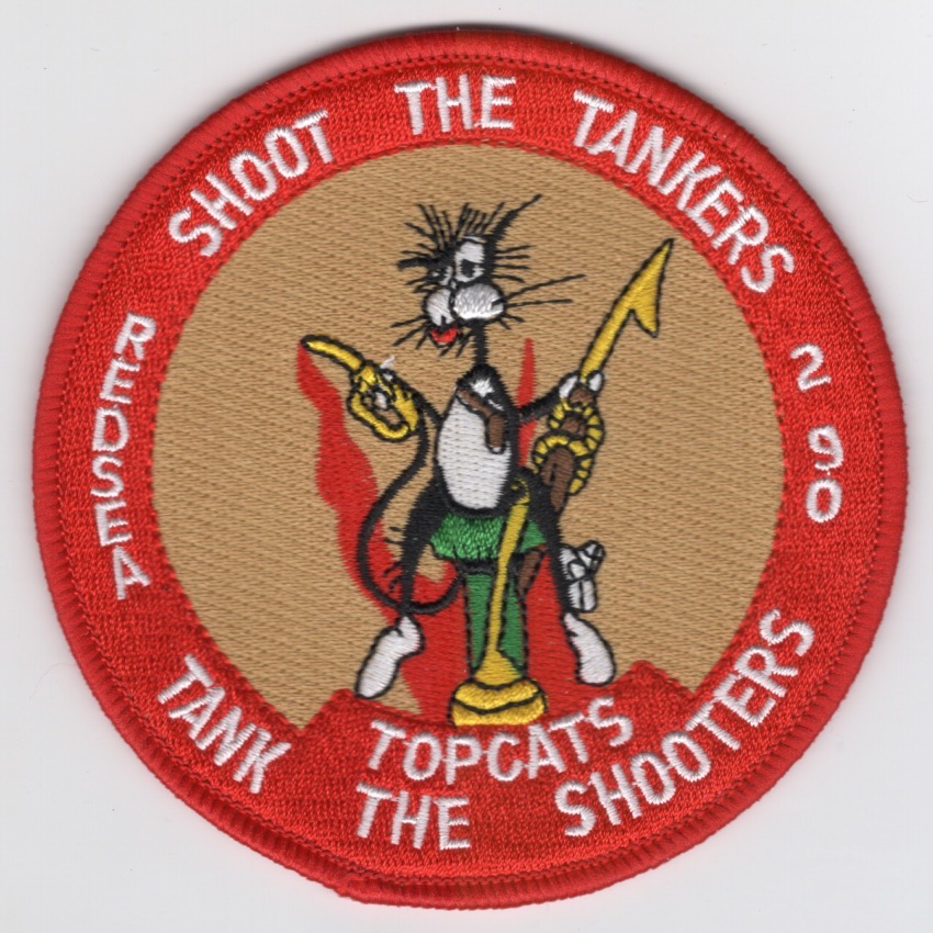This is one of the patches created by the VS-31 *TOPCATS* for their participation in Operation DESERT SHIELD in 1990 in the RED SEA area. It shows “Bill The Cat” with a Harpoon and a Refueling Hose. This patch does not come with velcro attached.