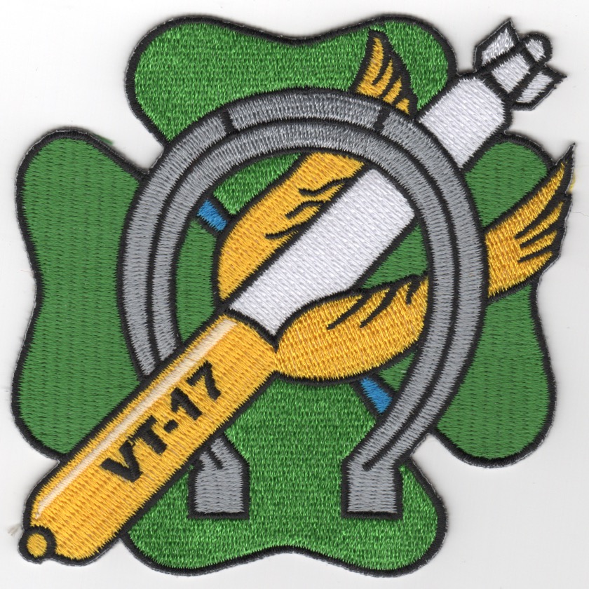 This is one of the “historical” patches created by VFA-25 recently. What was to become the FIST of the FLEET was conceived on September 15, 1941, when the keel of the USS BUNKER HILL (CV-17) was laid. On January 1 1943, VT-17 was formed under the command of LCDR Frank W. ÒSilver FoxÓ Whitaker. In those previous fifteen months, the US Navy was busy recruiting, training, and purchasing the aircraft and thousands of items the squadron would need when the USS Bunker Hill was commissioned on May 24, 1943. CVG-17 was also formed on January 1, 1943. This air group became CVBG-17, then CVBG-5 in 1946 and redesignated CVG-6 in 1948. It became CVW-6 in 1963 and was disestablished on April 1, 1992. Numerical designation of air groups began in 1942, many numbered according to their assigned ship (CV-17 .. CVG-17) and each ship had a distinctive graphic design for its aircraft. Aircraft assigned to USS Bunker Hill were identified with a vertical arrow on the tail. The ÒFist of the FleetÓ began as Torpedo Squadron 17 (VT-17) at NAS Norfolk (Virginia), initially assigned TBF-1 then TBM-1C aircraft as part of Air Group 17 (CVG-17). The TBM Avenger was the same as the Grumman designed TBF, but built by Eastern Aircraft, a division of General Motors. This patch has the “LIGHTER green” background with YELLOW threads and does not come with velcro attached.