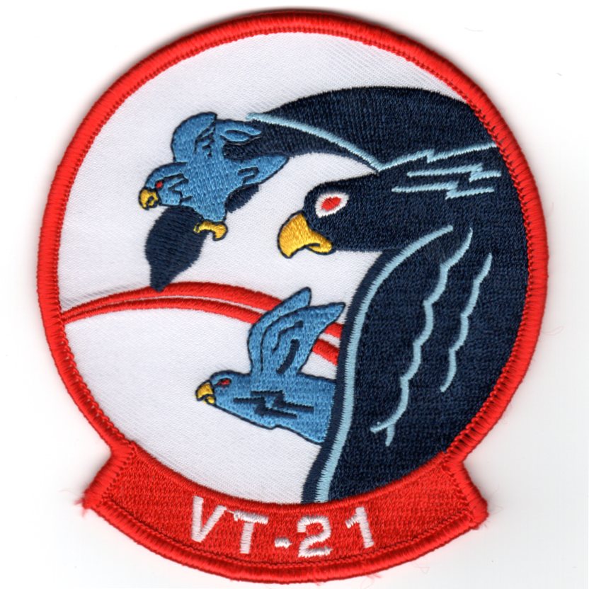 This is a “TWILL” version of the squadron patch for VT-21. The “Fighting Redhawks” of Flight Training Squadron TWENTY-ONE have been a mainstay of Naval Aviation for over 57 years. Originally established as advanced training unit two-zero-two in April 1951, the squadron was re-designated as Flight Training Squadron-Two One on May 21 1960. The first Navy and Marine Corps students were trained in the F-6F Hellcat. In May 1954, the squadron transitioned to its first jet aircraft, the F-9F Panther with the squadron later operating the F-9F8 cougar, TA-4J Skyhawk and, in Feb 1992, making the final transition to the T-45 Goshawk. This patch does not have velcro attached.