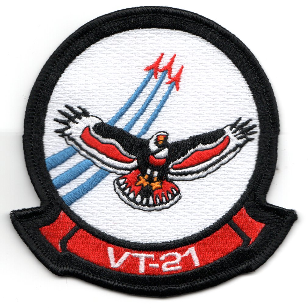 This is the squadron patch for VT-21, the “Fighting Redhawks” of Flight Training Squadron TWENTY-ONE which has been a mainstay of Naval Aviation for over 57 years. Originally established as advanced training unit two-zero-two in April 1951, the squadron was re-designated as Flight Training Squadron-Two One on May 21 1960. The first Navy and Marine Corps students were trained in the F-6F Hellcat. In May 1954, the squadron transitioned to its first jet aircraft, the F-9F Panther with the squadron later operating the F-9F8 cougar, TA-4J Skyhawk and, in Feb 1992, making the final transition to the T-45 Goshawk. This patch does not have velcro attached.