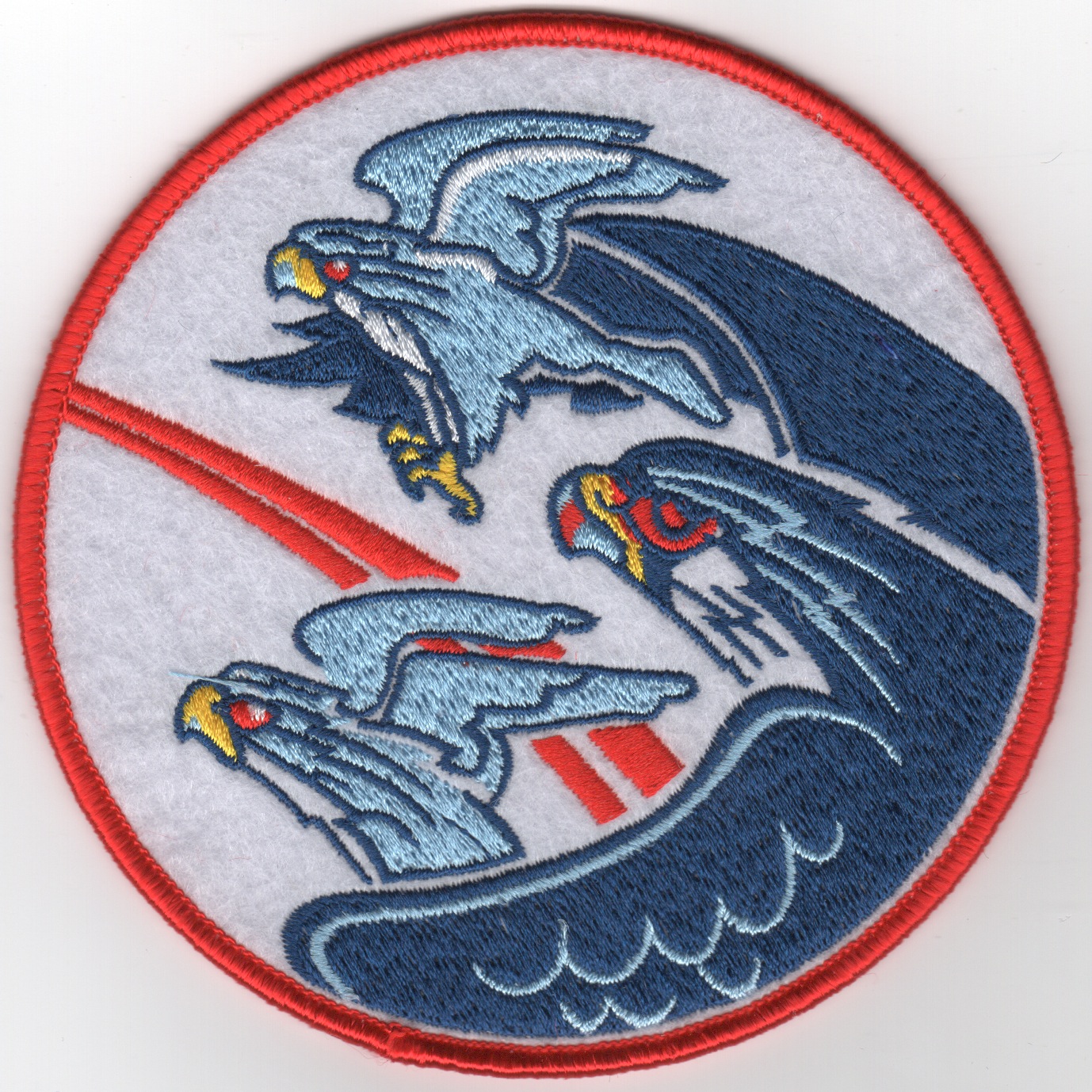 This is a “FELT” reproduction of the historical squadron patch for VT-21. The “Fighting Redhawks” of Flight Training Squadron TWENTY-ONE have been a mainstay of Naval Aviation for over 57 years. Originally established as advanced training unit two-zero-two in April 1951, the squadron was re-designated as Flight Training Squadron-Two One on May 21 1960. The first Navy and Marine Corps students were trained in the F-6F Hellcat. In May 1954, the squadron transitioned to its first jet aircraft, the F-9F Panther with the squadron later operating the F-9F8 cougar, TA-4J Skyhawk and, in Feb 1992, making the final transition to the T-45 Goshawk. This patch does not have velcro attached.