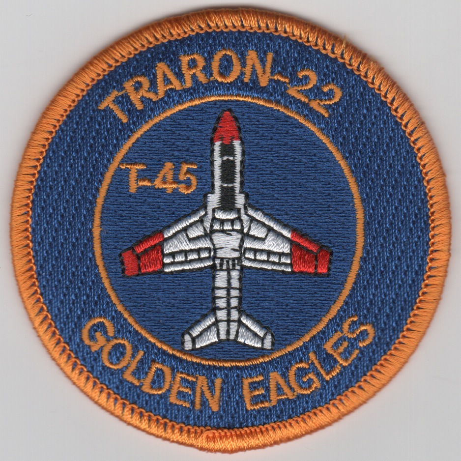This is the color version of VT-22’s T-45 Goshawk aircraft ‘bullet’ patch. The “King Eagles” of VT-22 fly the TA-4J and T-45A Goshawk out of NAS Kingsville, TX. They trace their lineage to 13 June 1949 when Advanced Training Unit (ATU) Six was formed at NAS Corpus Christi, TX. This patch does not come with velcro attached.