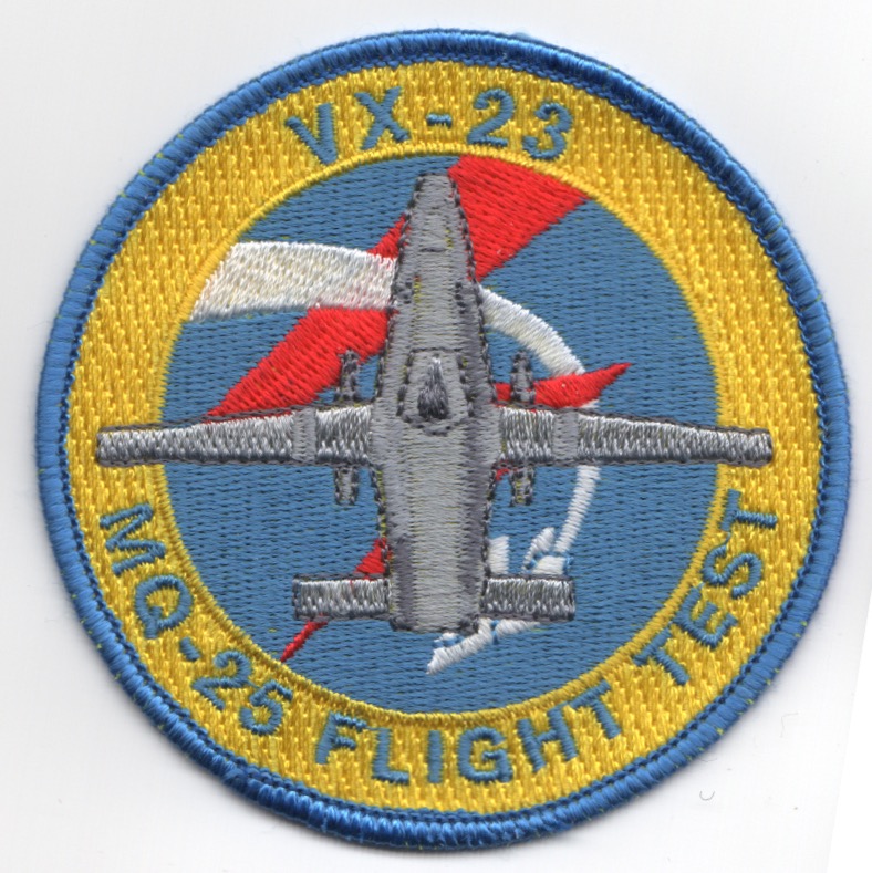 VX-23 is an aircraft test squadron that conducts research, testing and evaluation of fixed wing tactical aircraft and UAV’s. VX-23 provides aircraft, pilots, maintenance services, safety oversights and facility support for these operations. Their main mission is flying qualities and performance evaluations, shipboard suitability, propulsion system testing, tactical aircraft mission systems testing, ordnance compatibility and ballistics efforts, reliability and maintainability assessments, flight fidelity simulation and flight control software development. The squadron also provides Government Flight Representative, test monitoring, chase aircraft support, facilities for contractor demonstration, validation and development work involving tactical aircraft and associated systems. This is the “MQ-25 Flight Test” bullet patch worn by those testing the aircraft.