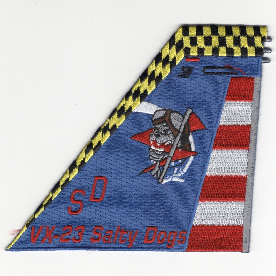 (From Squadron Supplier): VX-23 is an aircraft test squadron that conducts research, testing and evaluation of fixed wing tactical aircraft and UAV’s. VX-23 provides aircraft, pilots, maintenance services, safety oversights and facility support for these operations. Their main mission is flying qualities and performance evaluations, shipboard suitability, propulsion system testing, tactical aircraft mission systems testing, ordnance compatibility and ballistics efforts, reliability and maintainability assessments, flight fidelity simulation and flight control software development. The squadron also provides Government Flight Representative, test monitoring, chase aircraft support, facilities for contractor demonstration, validation and development work involving tactical aircraft and associated systems. This is the “SALTY DOGS* version of their tail fin, shows their mascot on there, and does not have velcro attached.