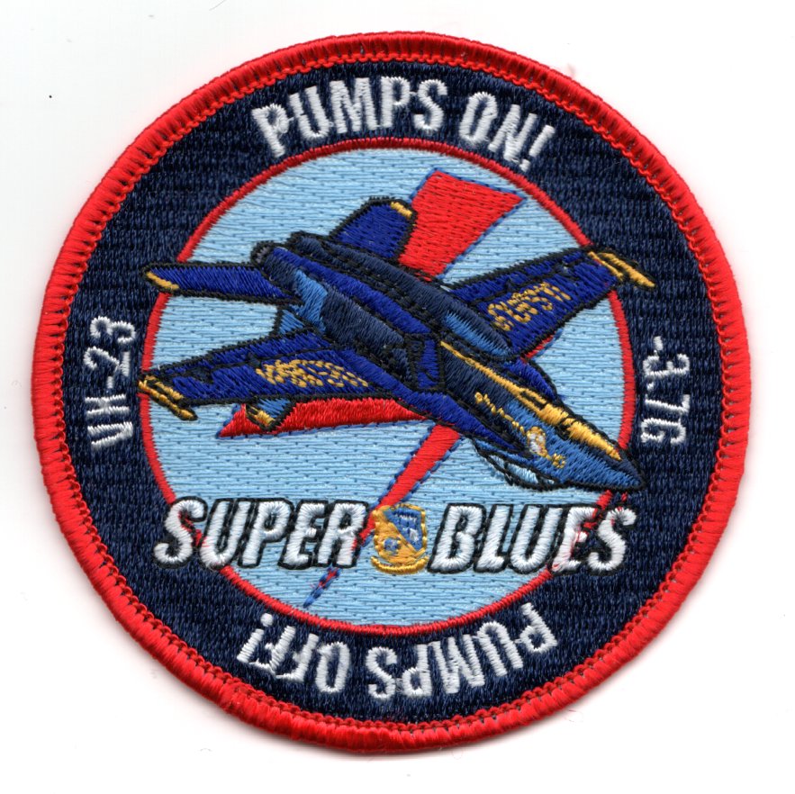 (From Squadron Supplier): VX-23 is an aircraft test squadron that conducts research, testing and evaluation of fixed wing tactical aircraft and UAV’s. VX-23 provides aircraft, pilots, maintenance services, safety oversights and facility support for these operations. Their main mission is flying qualities and performance evaluations, shipboard suitability, propulsion system testing, tactical aircraft mission systems testing, ordnance compatibility and ballistics efforts, reliability and maintainability assessments, flight fidelity simulation and flight control software development. The squadron also provides Government Flight Representative, test monitoring, chase aircraft support, facilities for contractor demonstration, validation and development work involving tactical aircraft and associated systems. This is the ‘Super Blues’ “PUMPS ON / PUMPS OFF” bullet patch worn by those flying for the Blue Angels. This patch does not have velcro attached.