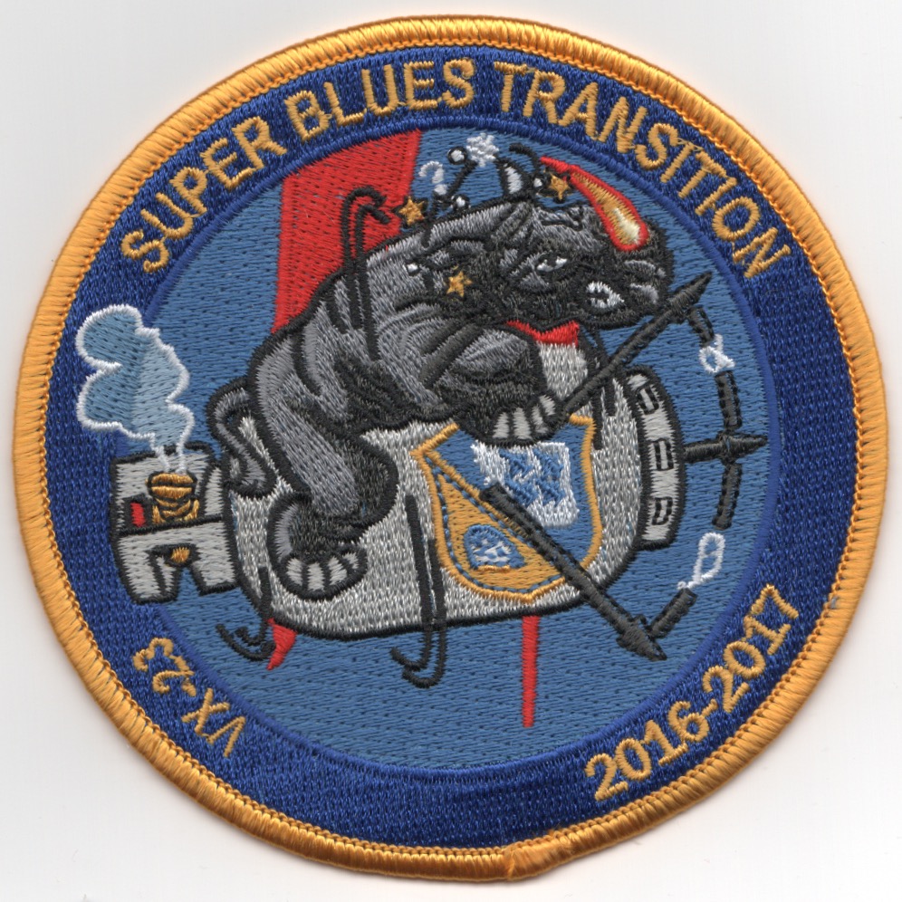 VX-23 is an aircraft test squadron that conducts research, testing and evaluation of fixed wing tactical aircraft and UAV’s. VX-23 provides aircraft, pilots, maintenance services, safety oversights and facility support for these operations. Their main mission is flying qualities and performance evaluations, shipboard suitability, propulsion system testing, tactical aircraft mission systems testing, ordnance compatibility and ballistics efforts, reliability and maintainability assessments, flight fidelity simulation and flight control software development. The squadron also provides Government Flight Representative, test monitoring, chase aircraft support, facilities for contractor demonstration, validation and development work involving tactical aircraft and associated systems. This is the “2016-2017 “Super Blues Transition” patch worn by those testing the aircraft being used for the transition to the F-35 for the Blue Angels. This patch does not have velcro attached.