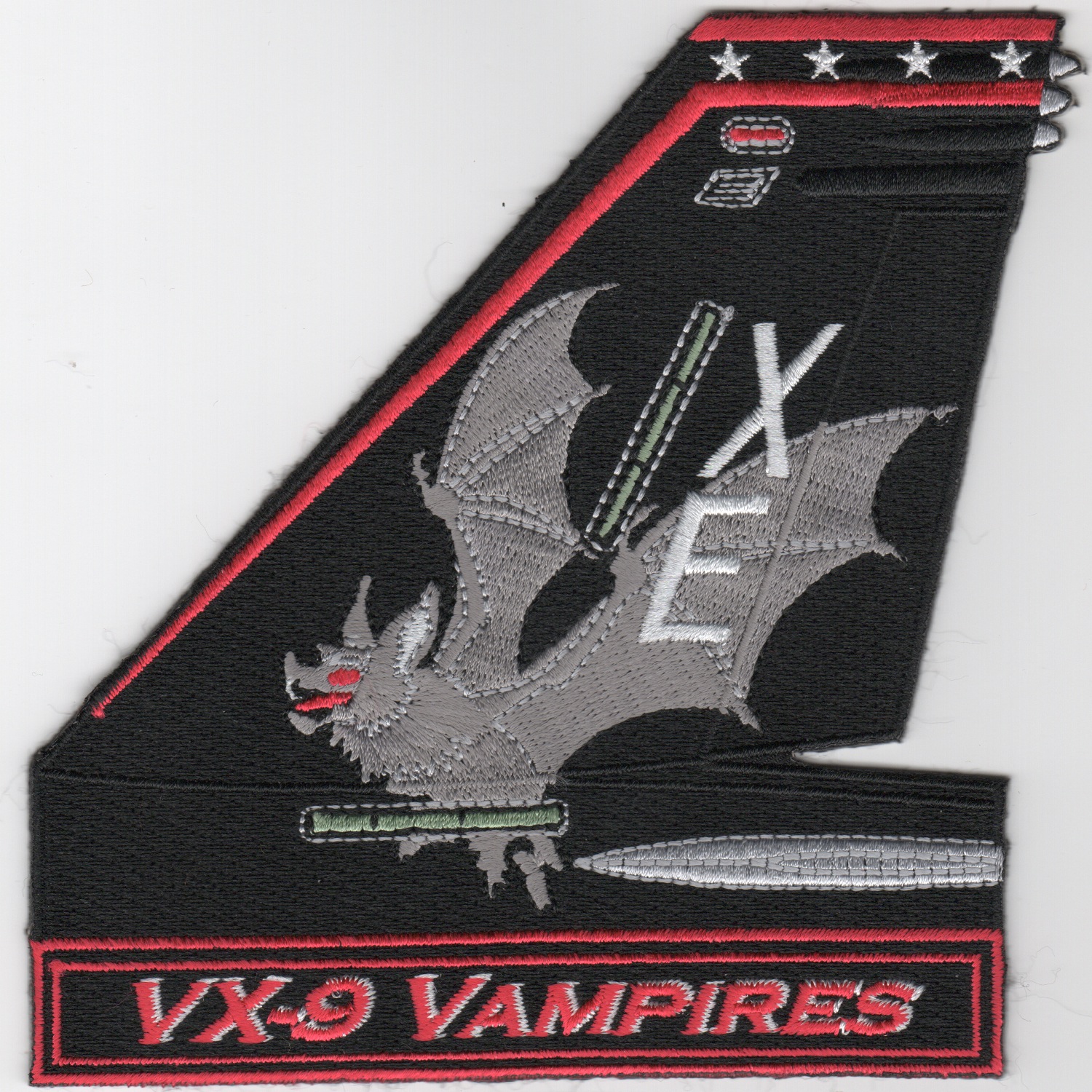 VX-9 is the Air Test and Evaluation Squadron Nine, (AIRTEVRON NINE, commonly referred to by its nickname, The Vampires) is a United States Navy air test and evaluation squadron based at Naval Air Weapons Station China Lake, California. Using the tail code XE, the squadron operates numerous aircraft and helicopters of the United States Navy and United States Marine Corps. This is the black version of their tailfin with their mascot, a Vampire Bat, on the side.