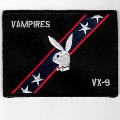 This is the black version with the Playboy Bunny silhouette of the VX-9 Vampires SLEEVE patch with the diagonal stripes with stars. This patch does not come with velcro already attached.