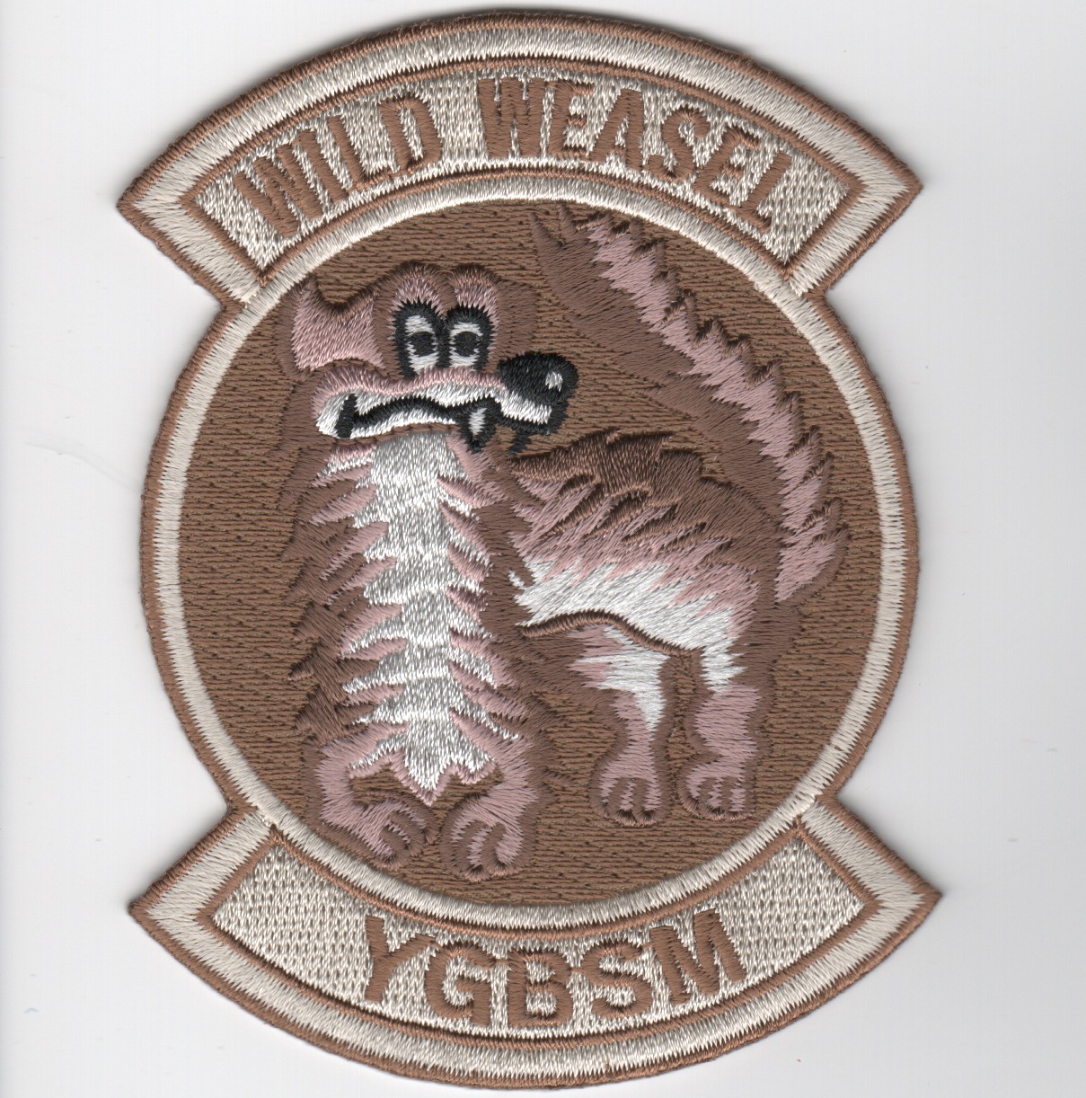 Wild Weasel is a code name given by the United States Armed Forces, specifically the US Air Force, to an aircraft, of any type, equipped with radar-seeking missiles and tasked with destroying the radars and SAM installations of enemy air defense systems. “The first Wild Weasel success came soon after the first Wild Weasel mission 20 December 1965 when Captains Al Lamb and Jack Donovan took out a site during a Rolling Thunder strike on the railyard at Yen Bai, some 75 miles northwest of Hanoi.” The Wild Weasel concept was developed by the United States Air Force in 1965, after the introduction of Soviet SAM missiles and their downing of U.S. strike aircraft over the skies of North Vietnam. This mission was flown by the F-4, F-100, A-4, F-105 and now the F-16 with the F-35 slated to replace them. This is the desert version of that historic patch and does not come with velcro attached.