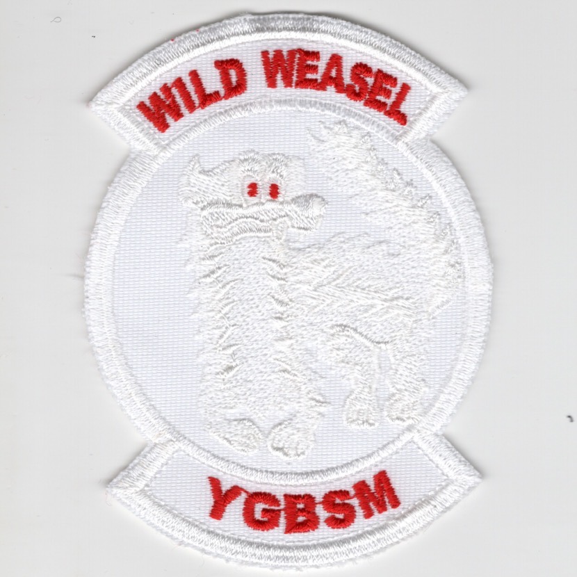 Wild Weasel is a code name given by the United States Armed Forces, specifically the US Air Force, to an aircraft, of any type, equipped with radar-seeking missiles and tasked with destroying the radars and SAM installations of enemy air defense systems. “The first Wild Weasel success came soon after the first Wild Weasel mission 20 December 1965 when Captains Al Lamb and Jack Donovan took out a site during a Rolling Thunder strike on the railyard at Yen Bai, some 75 miles northwest of Hanoi.” The Wild Weasel concept was developed by the United States Air Force in 1965, after the introduction of Soviet SAM missiles and their downing of U.S. strike aircraft over the skies of North Vietnam. This mission was flown by the F-4, F-100, A-4, F-105 and now the F-16 with the F-35 slated to replace them. This is the white version of that historic patch and does not come with velcro attached.
