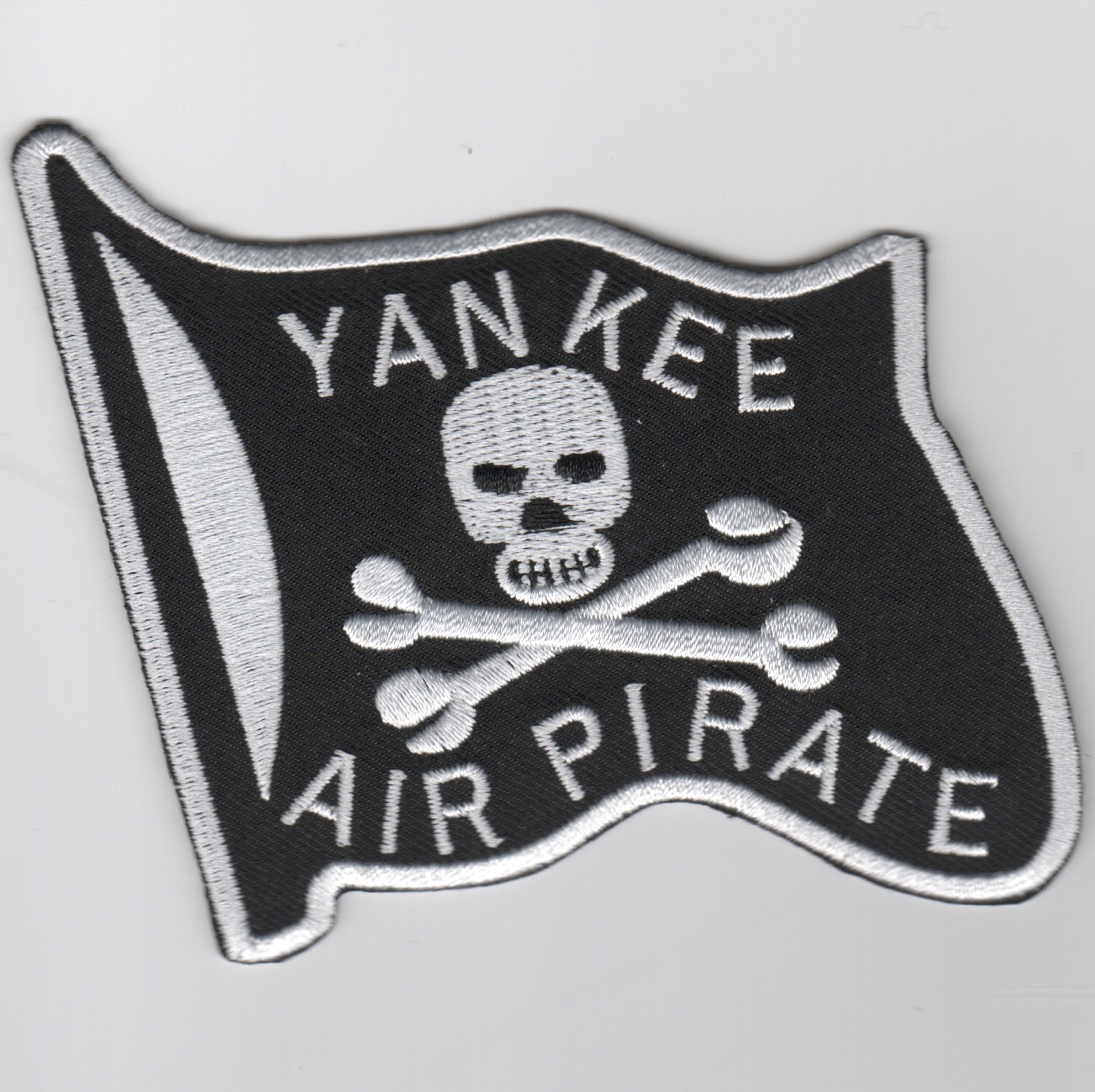 This is the large, black version (pirate colors) of one of the most famous patches in all of military aviation. This is the Yankee Air Pirate patch……This patch DOES come with velcro attached.